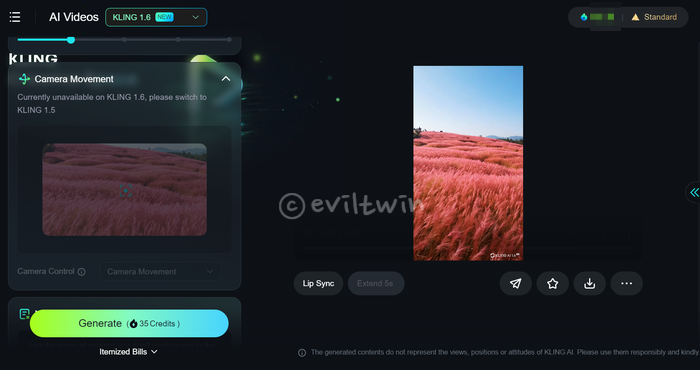 클링에서 비디오생성 버전 v.1.6 선택 후 영상화하고픈 프롬프트(영어)를 줌. 혹은 1번의 이미지 생성에 사용한 프롬프트(영어)를 그대로 주고 영상 생성하기
