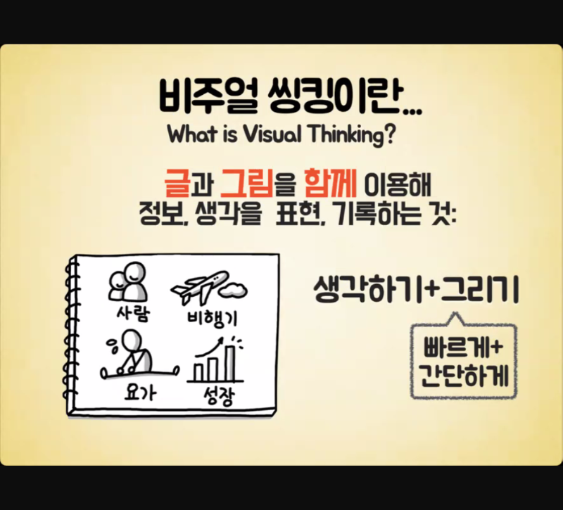 - 비주얼 싱킹이란? 글, 그림을 함께 이용해 정보, 생각을 표현, 기록하는 것이라고 정의
