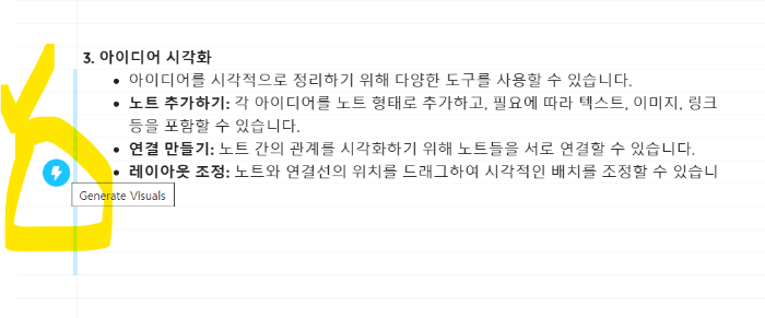 1. 아이디어 시각화 하고픈 곳에 마우스 오버한다. 또는 긴 글인 경우 전체 드래그하여 왼쪽 화면에 나타나는 번개 아이콘을 선택