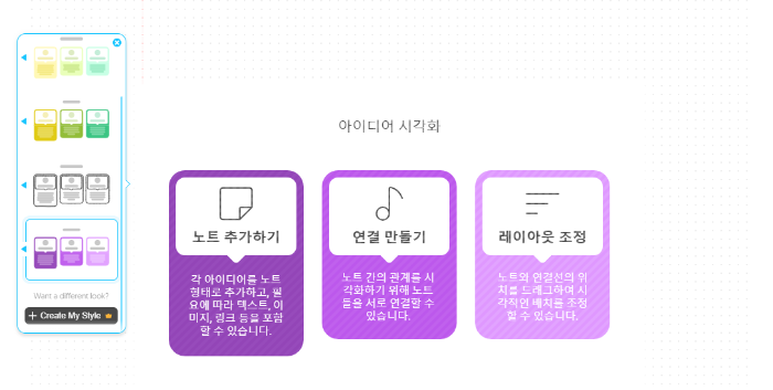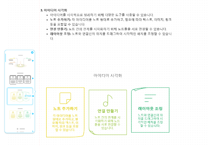- 노트 추가하기 : 각 아이디어를 노트 형태로 추가하고, 필요에 따라 텍스트, 이미지, 링크 등을 포함할 수 있습니다