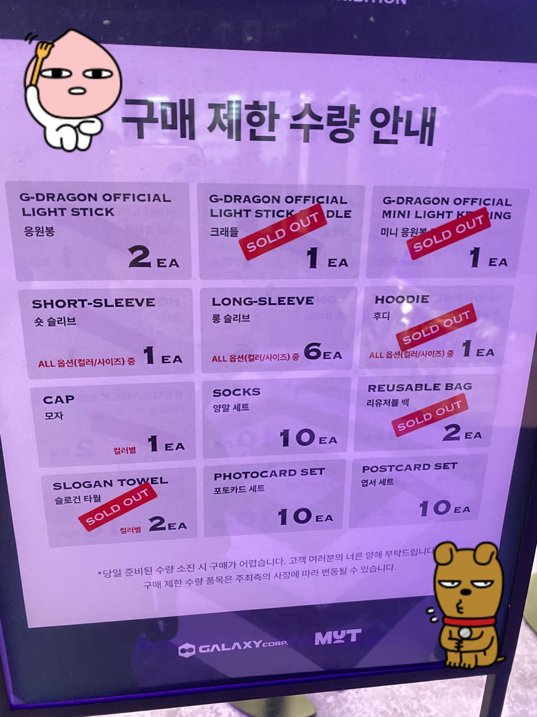 상품 사는데 초상권까지 내놔야 해. 너무하네. 서비스로 초상권 비용으로 입장한 사람들 웰컴키트라도 줘라요.. 그리고 토요일 오후 현재 굿즈 상태 및 구매 제한 수량 안내