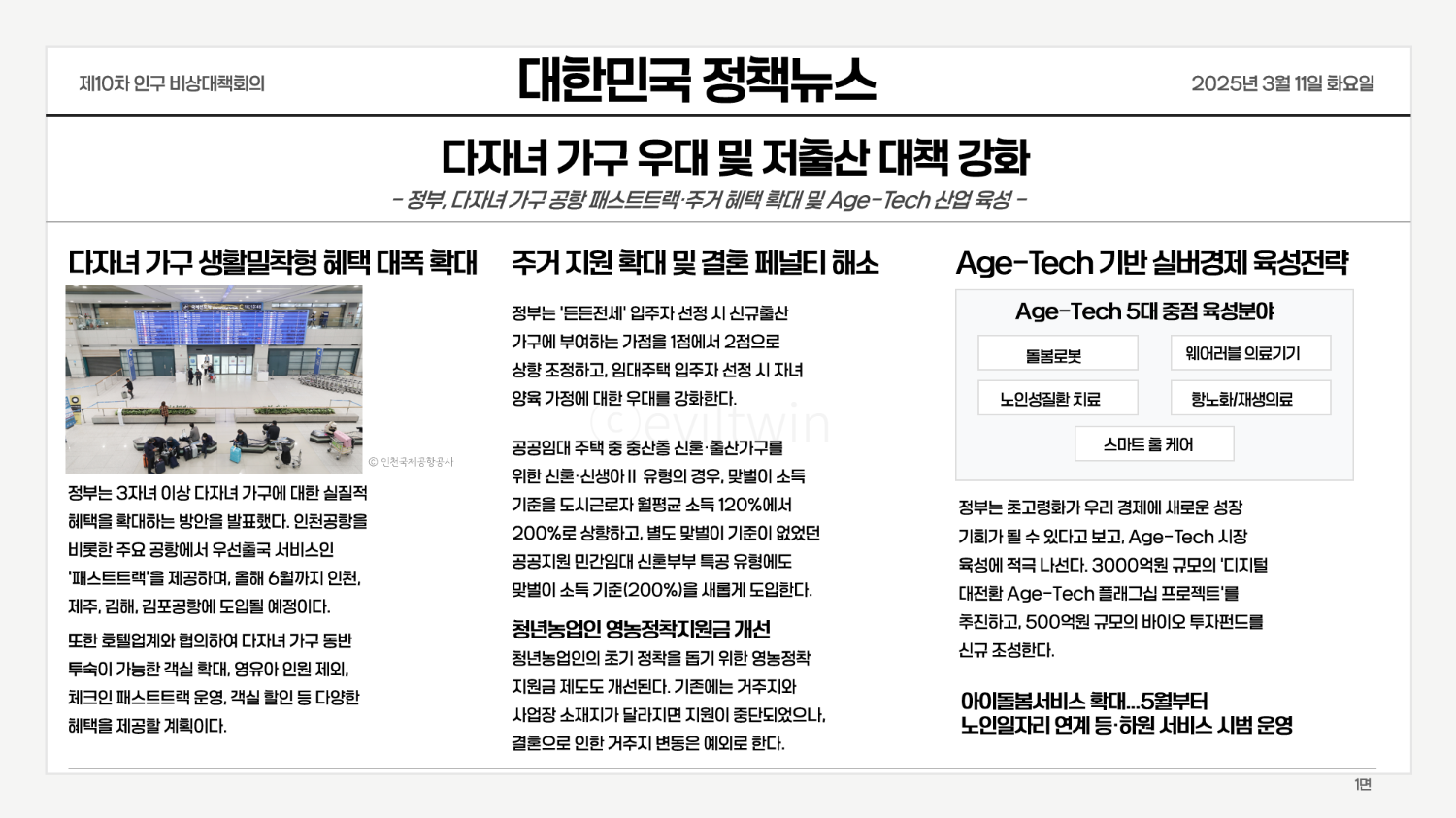 저출산시대에 초고령화 정부 새로운 전략 회의 내용을 간추려 뉴스페이퍼처럼 만들어 보았습니다. 사이트 텍스트가 많아서 눈이 아파 직접 손품 팔았는데, 한눈에 보기 참 쉽죠?