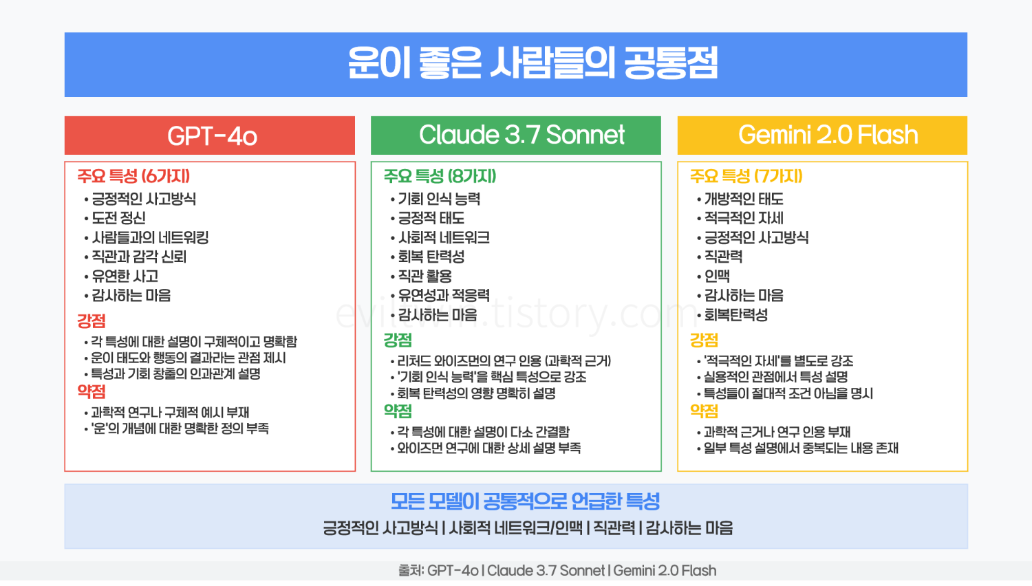 챗지피티의 GPT4o, 클로드 Claude 3.7 Sonnet. 제미나이 Gemini 2.0 Flash 각각의 AI 서비스 엔진에서 "운이 좋은 사람들 공통점" 과 특징을 알려달라고 하였고 받은 답을 복사하여 클로드에서 한 장으로 비교 정리 해보았습니다.