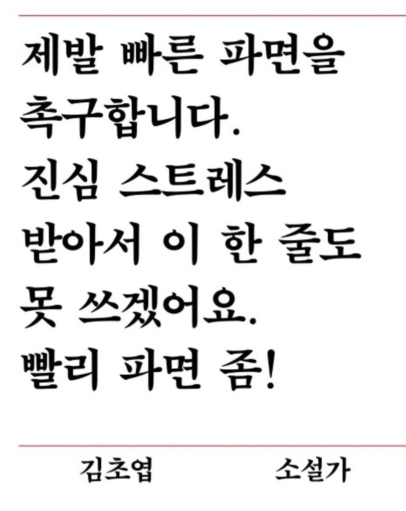 진심 스트레스 받아서 이 한 줄도 못 쓰겠어요. 빨리 파면 좀! _ 김초엽 소설가
