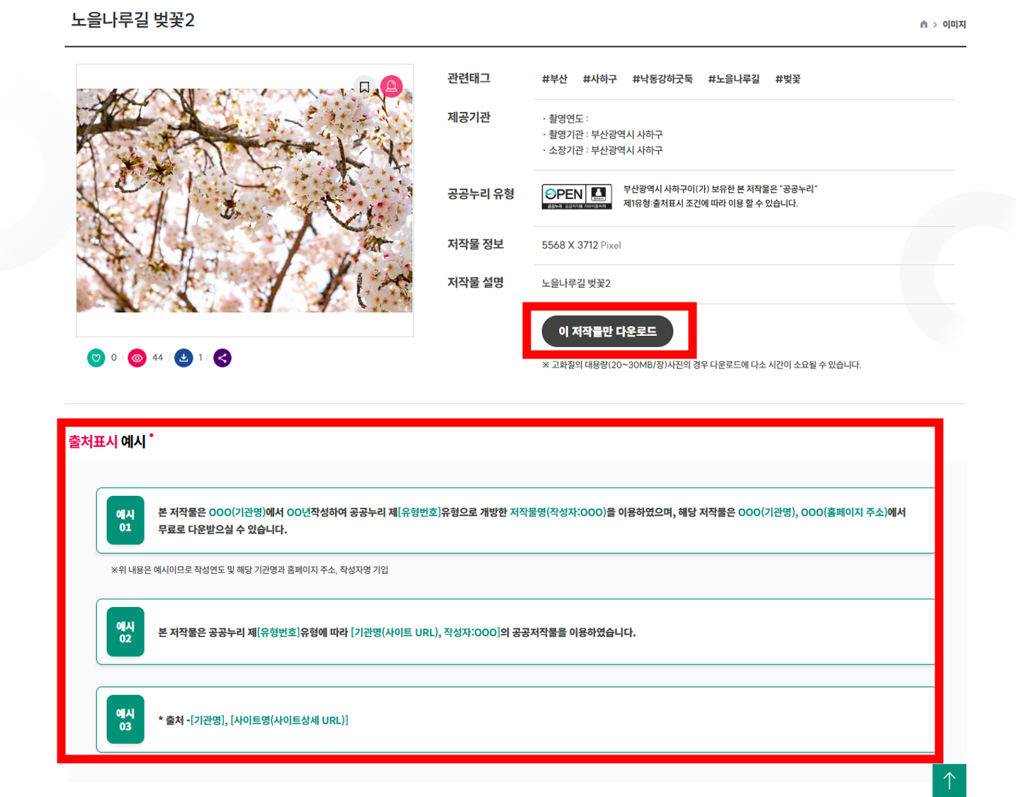 - 라이선스 : 공공누리(KOGL) 또는 CC-BY 적용 (출처 표시 시 상업적 이용 가능/단, 다운로드 시 1년 사용제한)