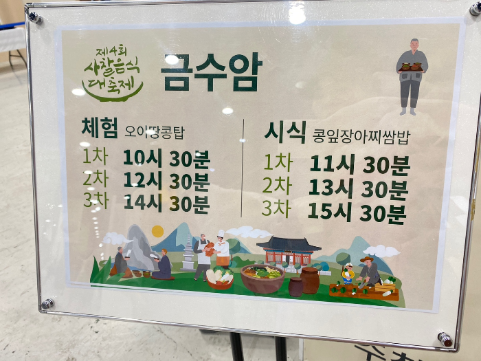 이런식으로 절 별로 체험행사와 시식가능한 음식, 또는 템플스테이 홍보 등을 하거나 행사 부스에서 토크쇼 [일요일]에는 정관스님과 파브리 셰프의 토크 등이 있었습니다.