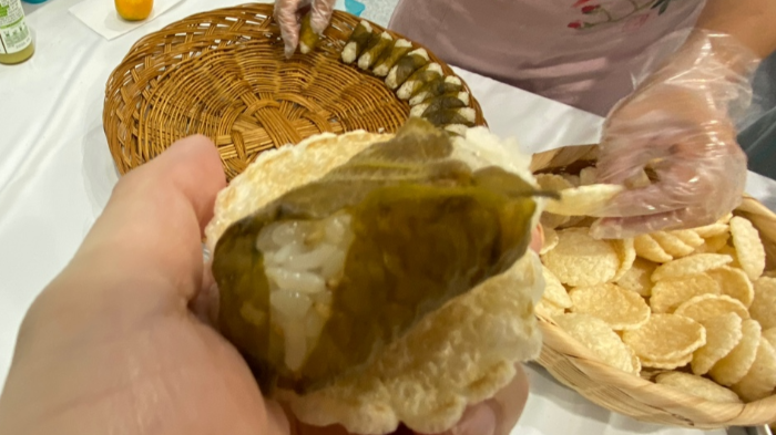 음식 받침대를 전부 뻥튀기로 줬어요. 미니 뻥튀기 위에 주먹밥을 주거나, 개인 젓가락 도시락통, 텀블러 등을 챙겨오라는 홍보가 있었습니다. 저는 왜 깜빡하고 안가져간 것인지 ㅋㅋ