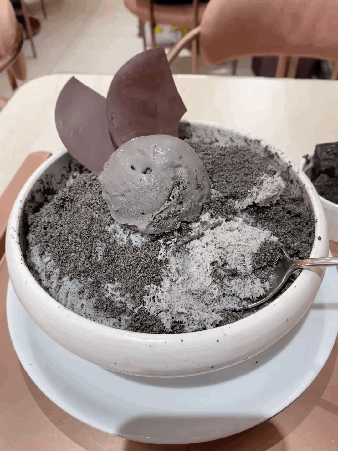 곱게 간 우유 빙수에 흑임자 소스를 섞어 은은한 회색빛을 띄고, 위에는 초콜릿 데코와 아이스크림이 올라옵니다. 곁들임으로 나온 팥과 흑임자 떡도 맛을 더해주었고, 특히 빙수 아래에 꿀에 절인 견과류가 숨어 있어 씹는 재미까지 있었어요.