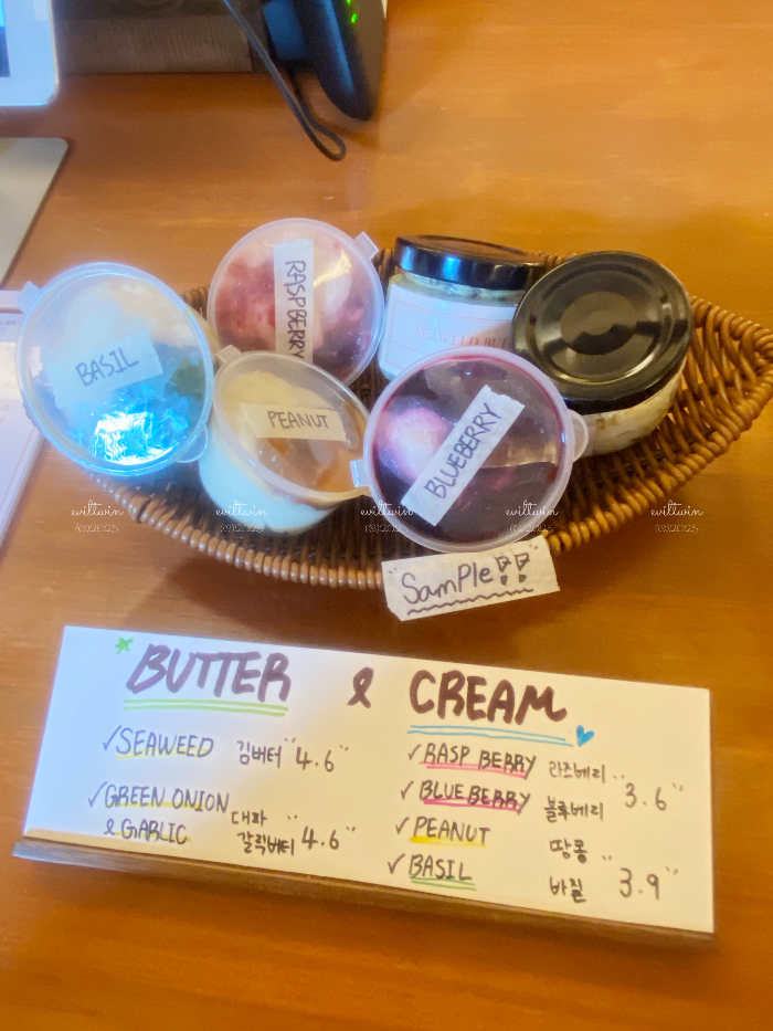 또한 버터 크림 종류가 다양해 선택의 재미가 있습니다. 김 버터, 대파&갈릭 버터, 라즈베리, 블루베리, 땅콩, 바질 크림 등 취향에 따라 골라 먹을 수 있습니다.