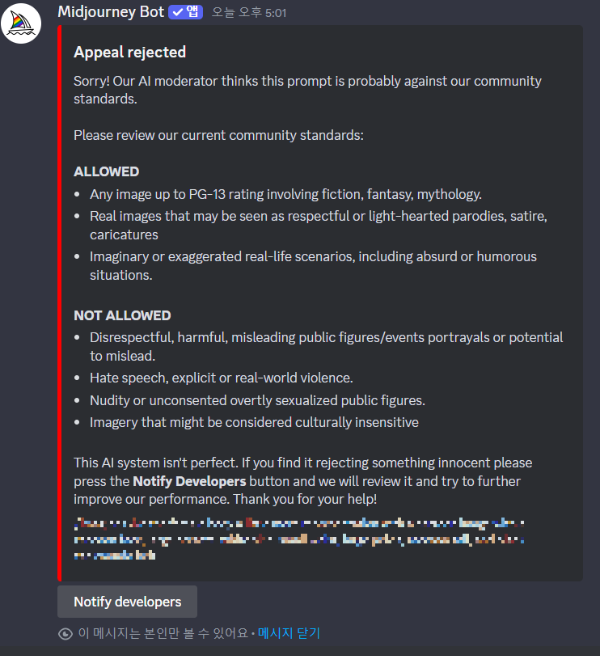 미드저니 역시 우리는 그것을 만들 수 없어! 역시 안내 문구를 보여줬다.