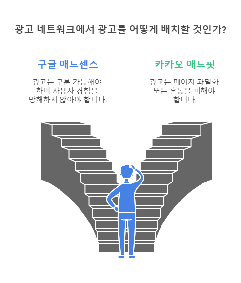 카카오 애드핏 역시 다른 광고 네트워크의 광고와 함께 사용이 가능하지만, 페이지 과밀화 또는 광고 간 혼동을 유발해서는 안 됩니다.