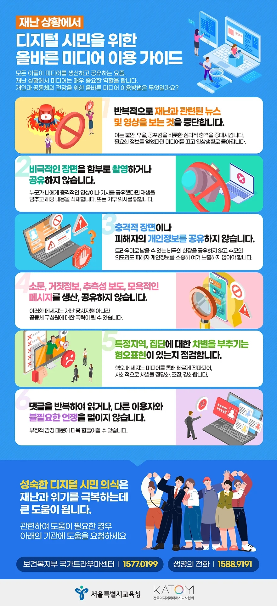 전국미디어리터러시교사협회는 지난 2022년 11월에 재난적 상황을 접한 어린이와 청소년이 참사 관련 뉴스나 정보에 적절히 접근해 이를 책임 있게 이용할 수 있도록 ‘디지털 시민을 위한 미디어 이용 가이드라인’을 만들어 배포하였습니다. 당시 제작한 가이드라인을 서울특별시교육청에서 새롭게 디자인하여 배포하게 되었습니다. 교육 현장에 도움이 되기를 바랍니다.